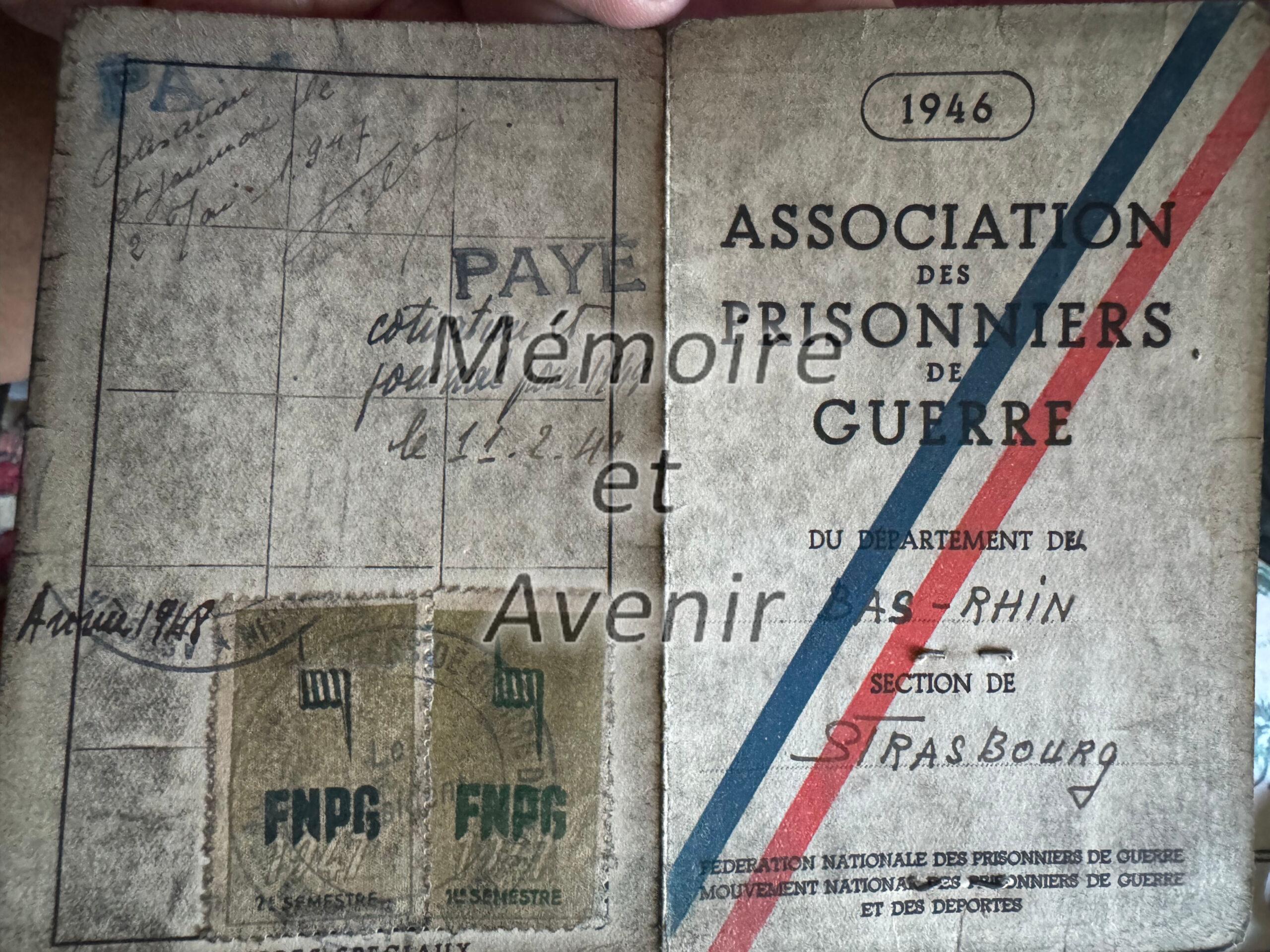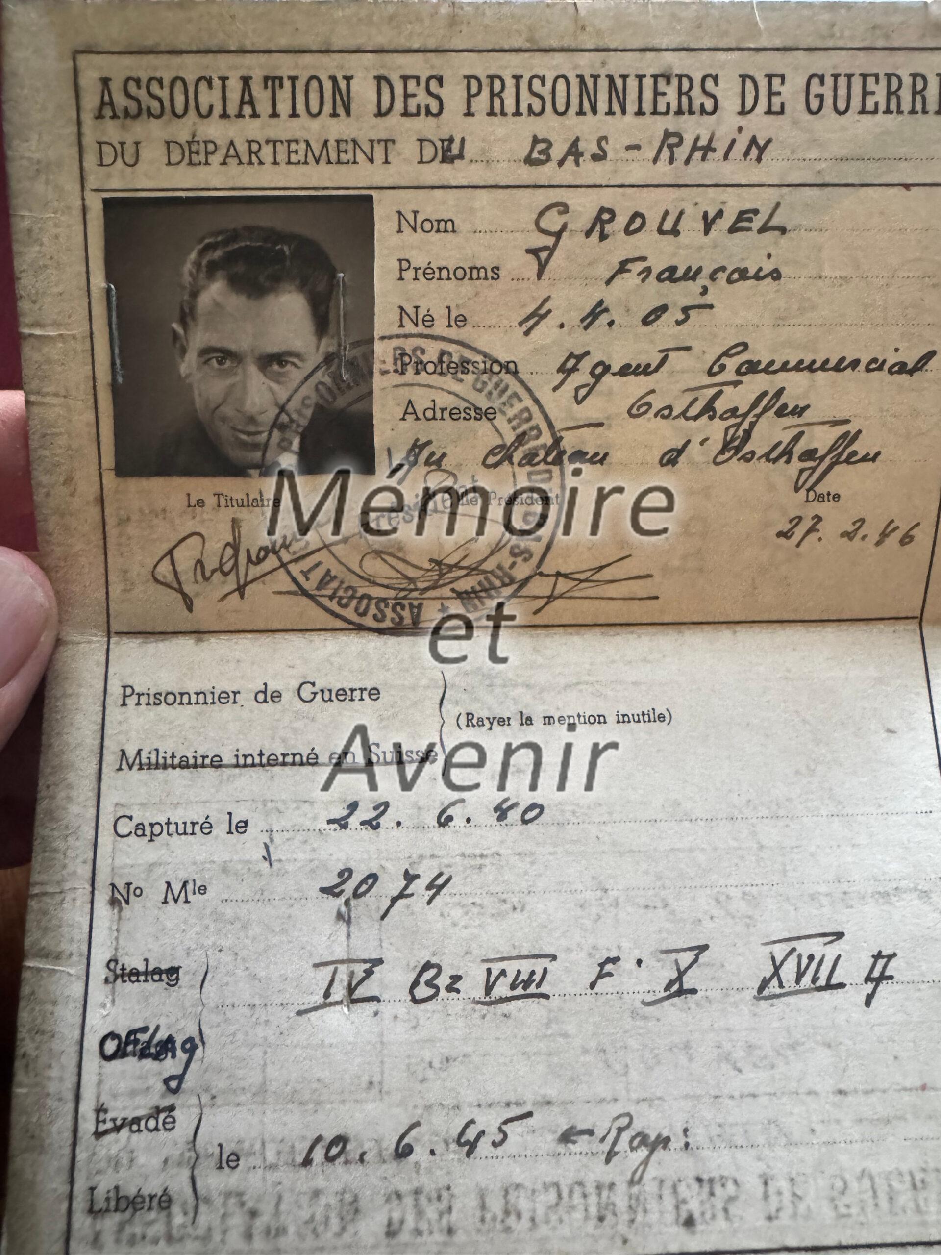 François GROUVEL - carte de l'association des prisonniers de guerre du Bas-Rhin 1946